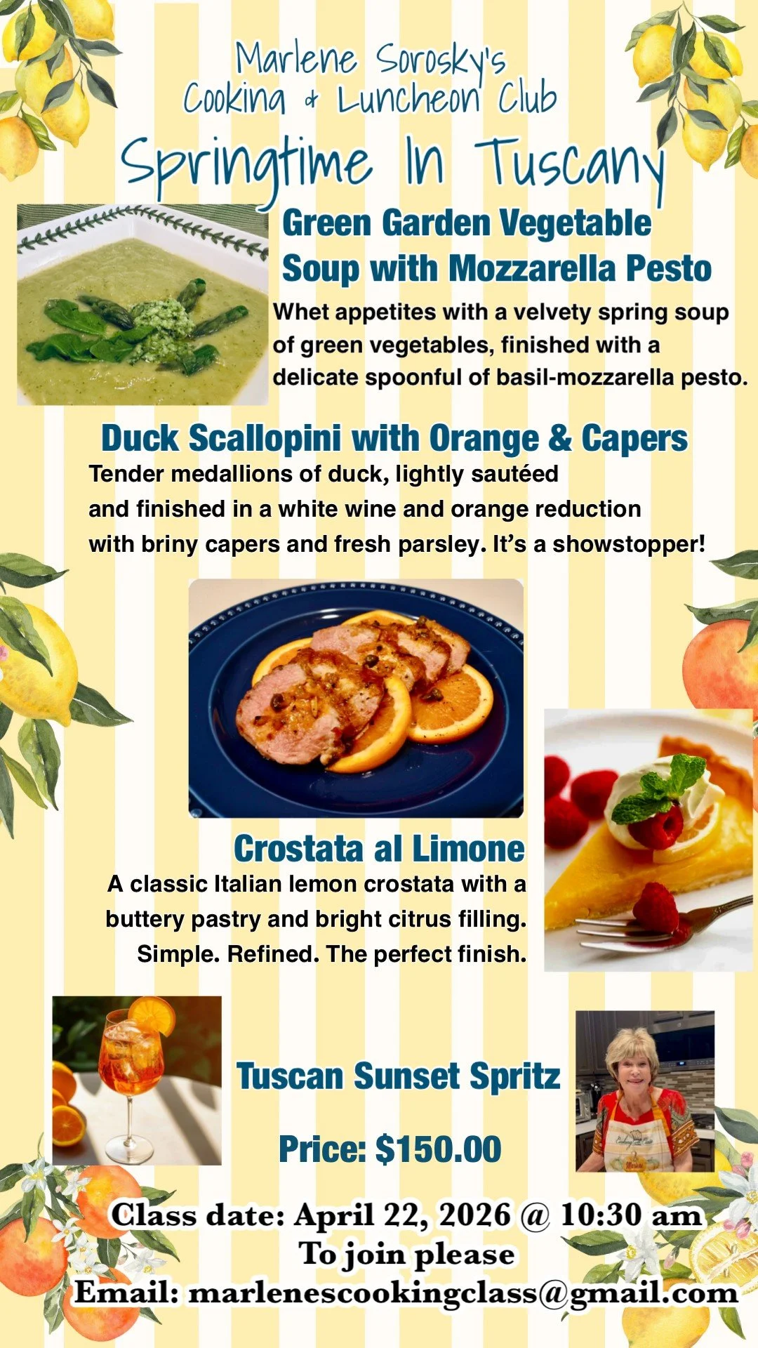 “Marlene’s classes are entertaining, as well as educational. She shares wonderful stories of the many times she spent with great chefs. You need not be an accomplished cook to create a great meal, because Marlene’s recipes are easy to follow and always prove to be a winner.”