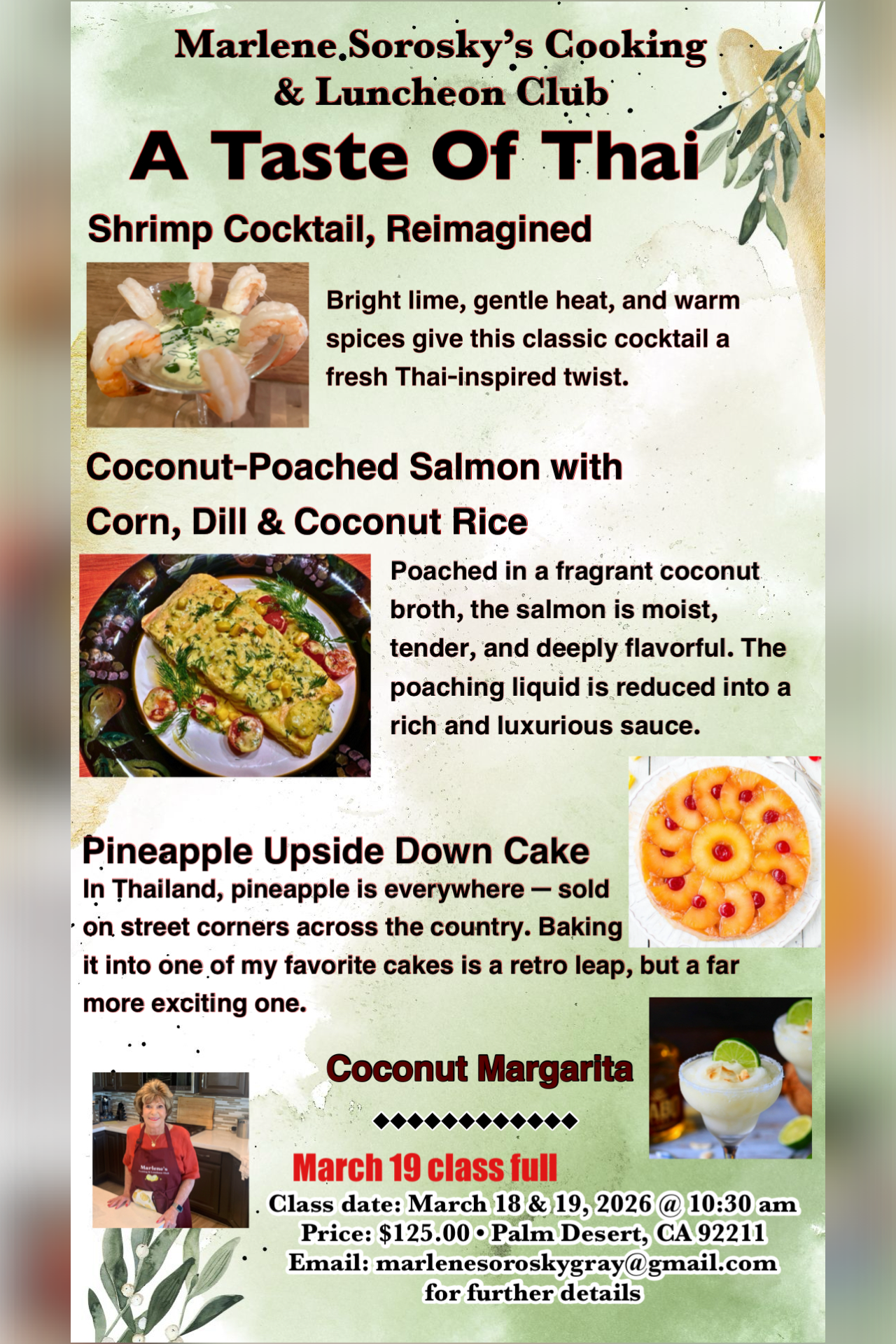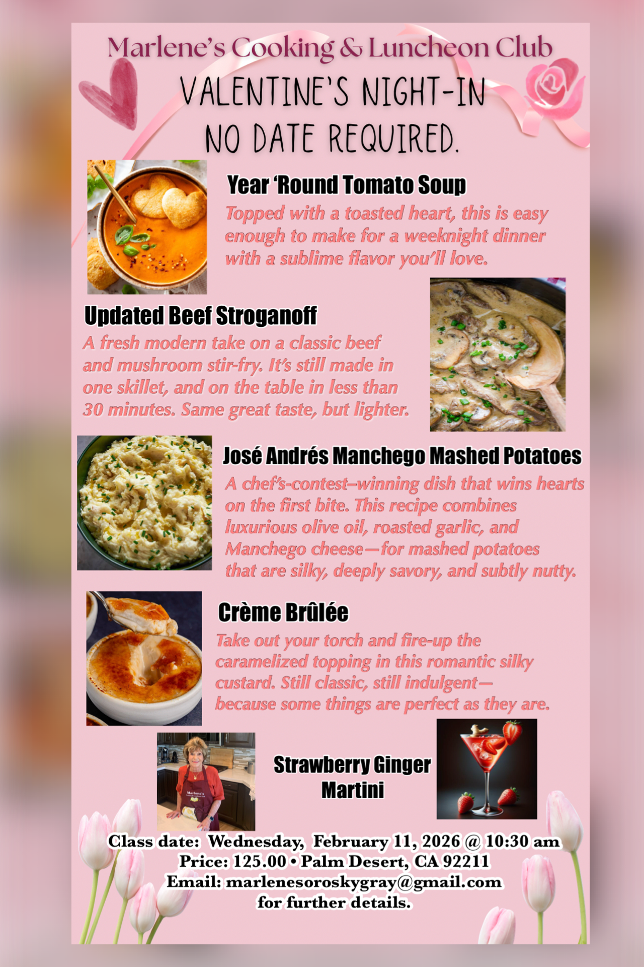 Marlene is excited to announce that she is again teaching in her home in Palm Desert, CA. The classes are small, intimate and are a fun way to spend an afternoon. After the menu demonstration is completed, you are invited to stay and have luncheon and socialize with your fellow students and Marlene. If you are interested in attending a class in Marlene’s home in Palm Desert, please contact her for further information @ marlenescookingclass@gmail.com