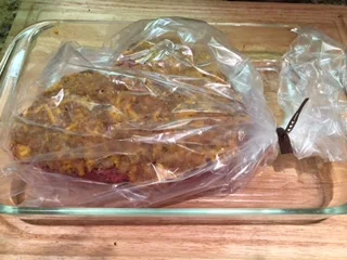 - Put an oven roasting bag into a 9x13-inch baking dish. Using a large spatula, move steak to bag. Cut 6 small slits in the top.