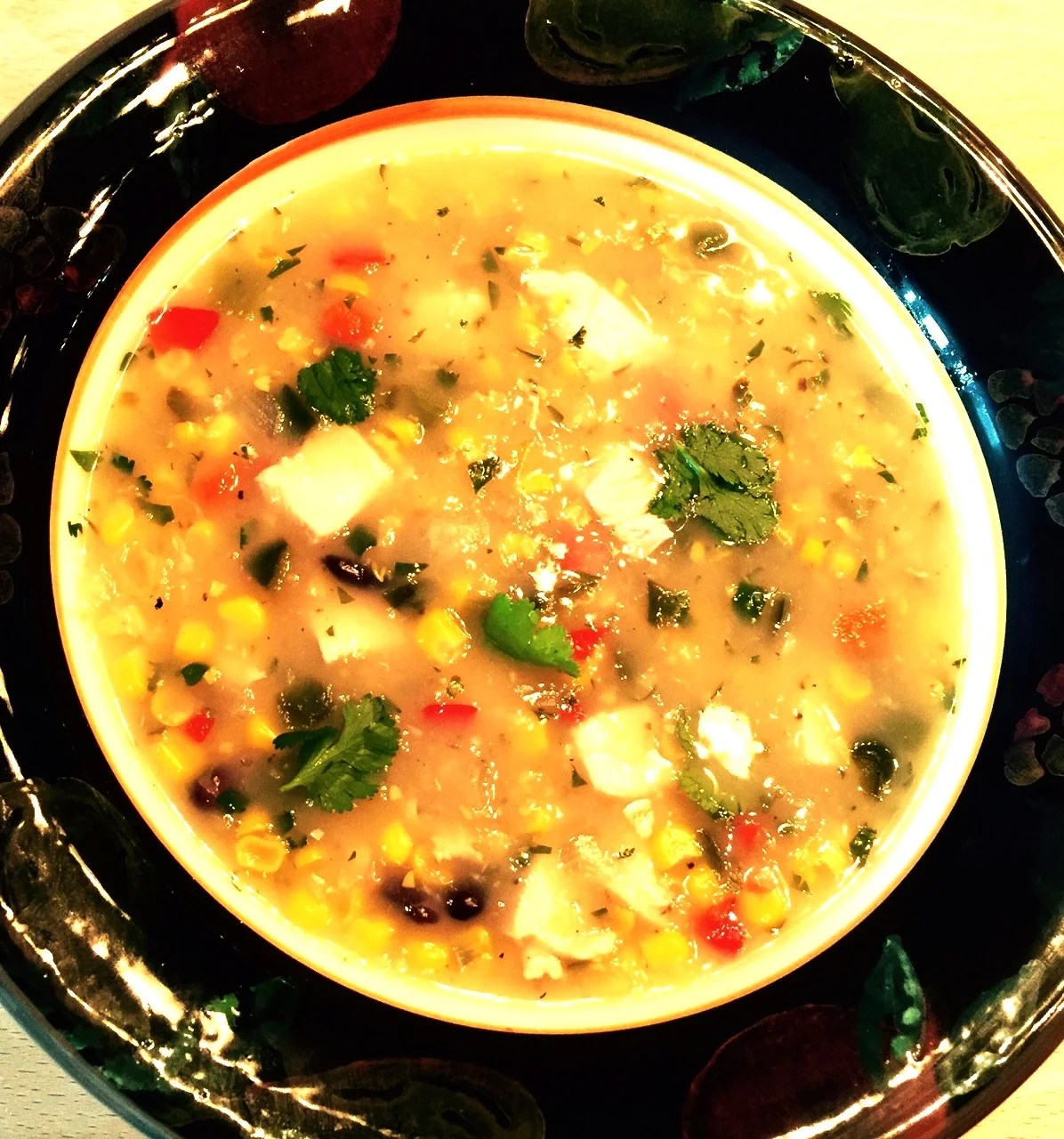 I've made it many times with whatever package of frozen veggies happen to be in my freezer. I think it works best with a Southwestern blend with corn, chilies, black beans and bell peppers. If I have an extra can of any type of beans in my pantry, I drain and add them. This is also a good recipe to empty my refrigerator produce drawer. The soup benefits from the addition of almost any herbs or veggies. Fresh thyme, basil, oregano, sage and tarragon have all made appearances, as well as peas, green onion, kale and spinach. I often have a package of boneless, skinless chicken breasts in my fridge or freezer, so it was a no-brainer to cut them up and throw them in. Ham, bacon, turkey and shrimp have all worked well, too. It is also very tasty made vegetarian with vegetable broth and no meat.