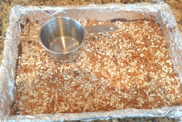 Use a measuring cup to firmly press the pretzel crumbs into the chocolate before and after baking.