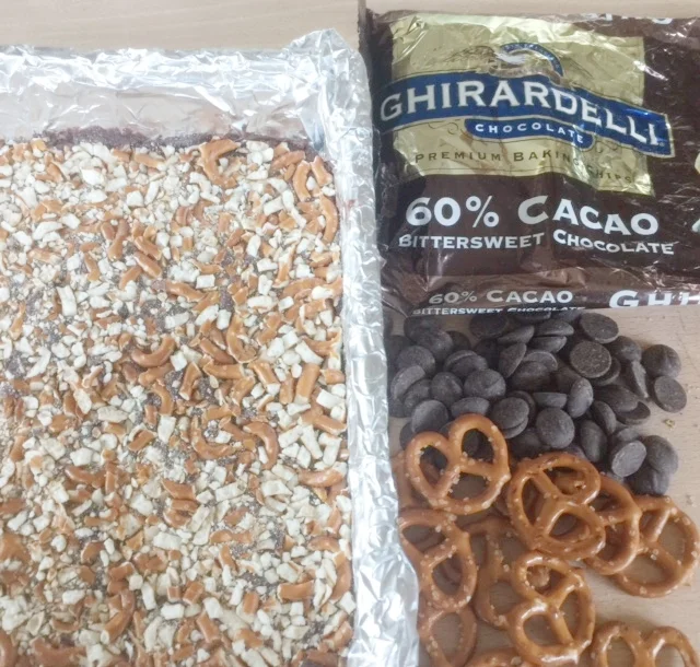 - Bake for 30 minutes. Remove from oven and press on pretzels with the cup to help them adhere. Remove to a rack to cool, then refrigerate until firm. Pull up on foil handles to remove cookie slab to a cutting board and pull off foil. Cut into 1 3/4-to 2-inch squares.