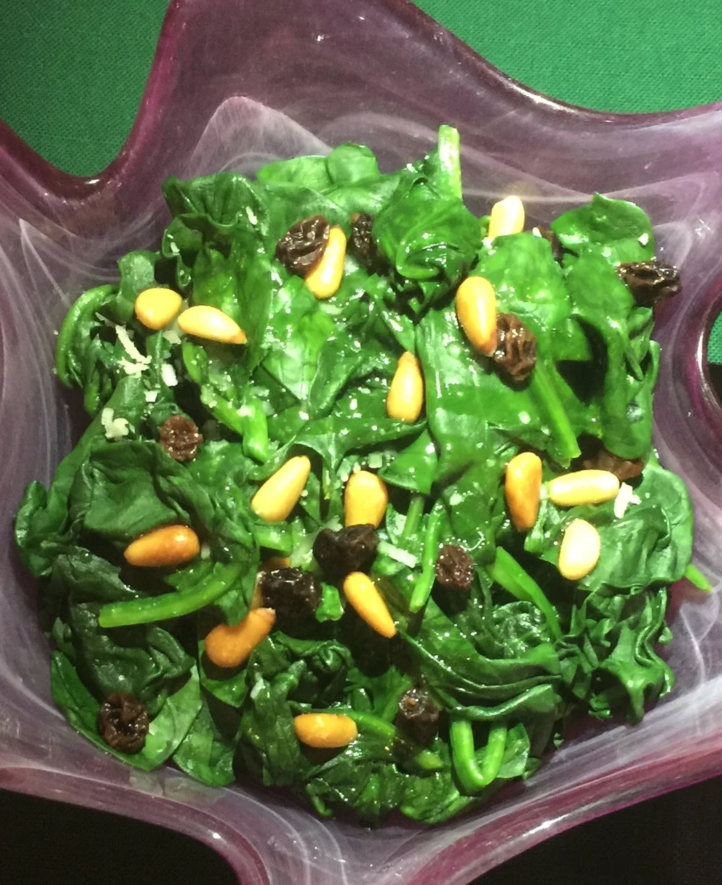 The secret to its success is that the spinach is never boiled. The leaves are cooked with some water clinging to them until they are evenly wilted. Technically, they are steamed. They are then briefly sauteed in olive oil with garlic, currants and pine nuts. The best part is that the leaves never get to that soggy, limp stage.