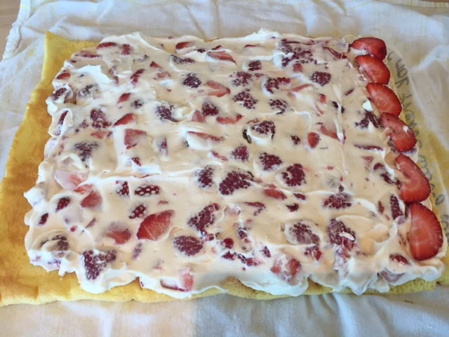 This started out to be strawberry shortcake. But I never do what's expected. For starters, I always add raspberries to my shortcakes because their tartness adds a layer of flavor to dulcet strawberries. I seldom use biscuits because a sponge cake is far more elegant and can be made ahead. Whipped cream is great, but melted white chocolate added to it puts it over the top. Finally, why layer the berries when they are so much more elegant rolled up? Just call this shortcake dressed up for a black tie.