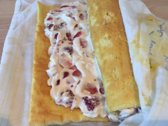 I would love to think I could convince you that this is easier than it looks. It is several more steps than assembling a traditional shortcake. But then, it is so much more impressive. Perhaps if you imagine me in your kitchen helping you roll the cake in the filling you would feel more confident. Just keep on rolling. Any filling that squeezes out onto the towel makes a terrific treat for you to eat and will never be missed in the finished dessert.
