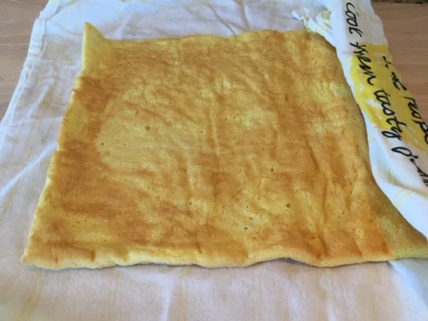 Invert cake onto towel sprayed with non-stick coating. Roll cake into towel. Set aside until cool.