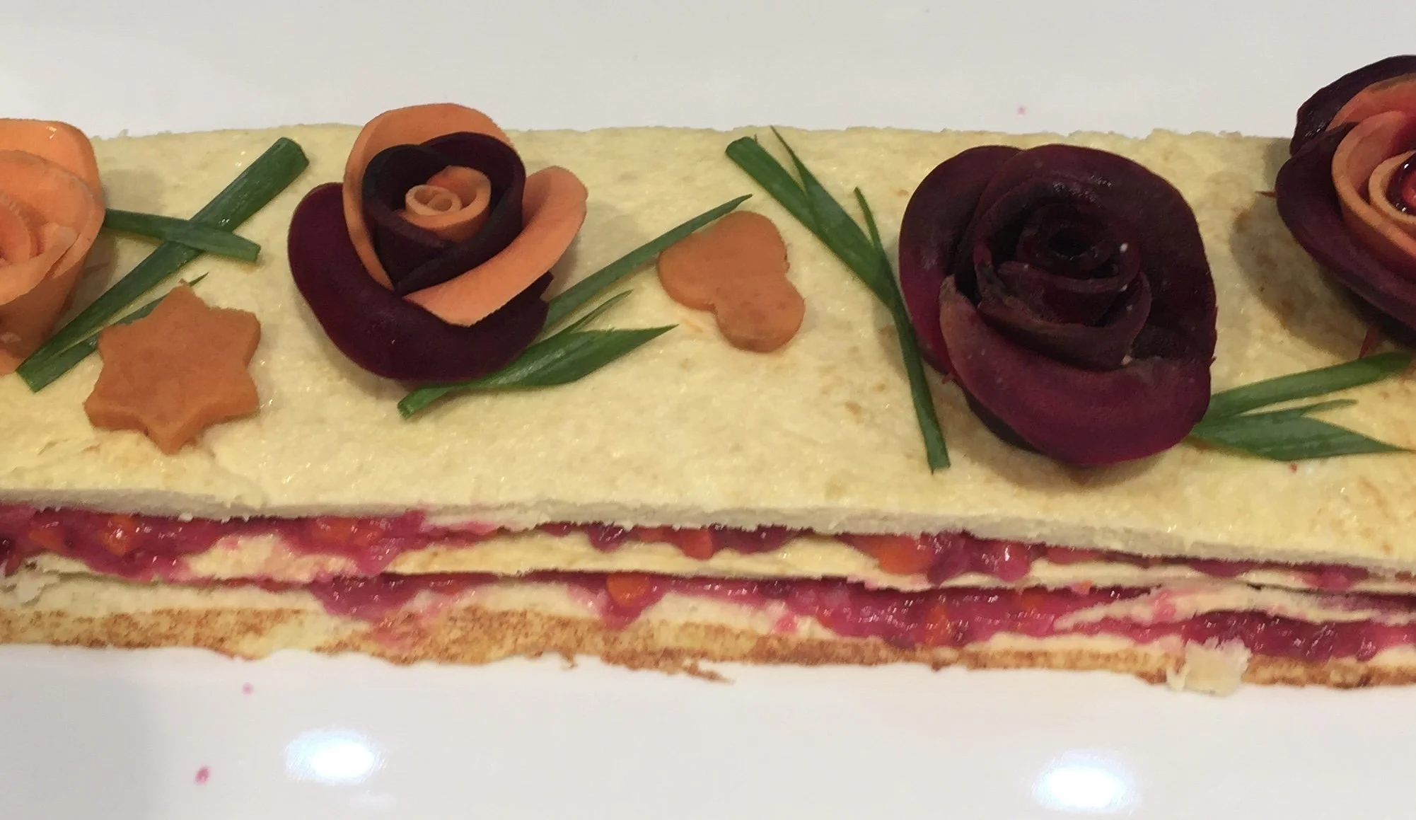 7. Optional garnish: To make carrot and beet flowers, using small canapé cutters, cut flower shapes from sliced cooked carrots and beets. For roses, thinly slice cooked beets and carrots. Wrap one slice tightly for the center and then loosely wrap the other slices around it. Secure with toothpicks.