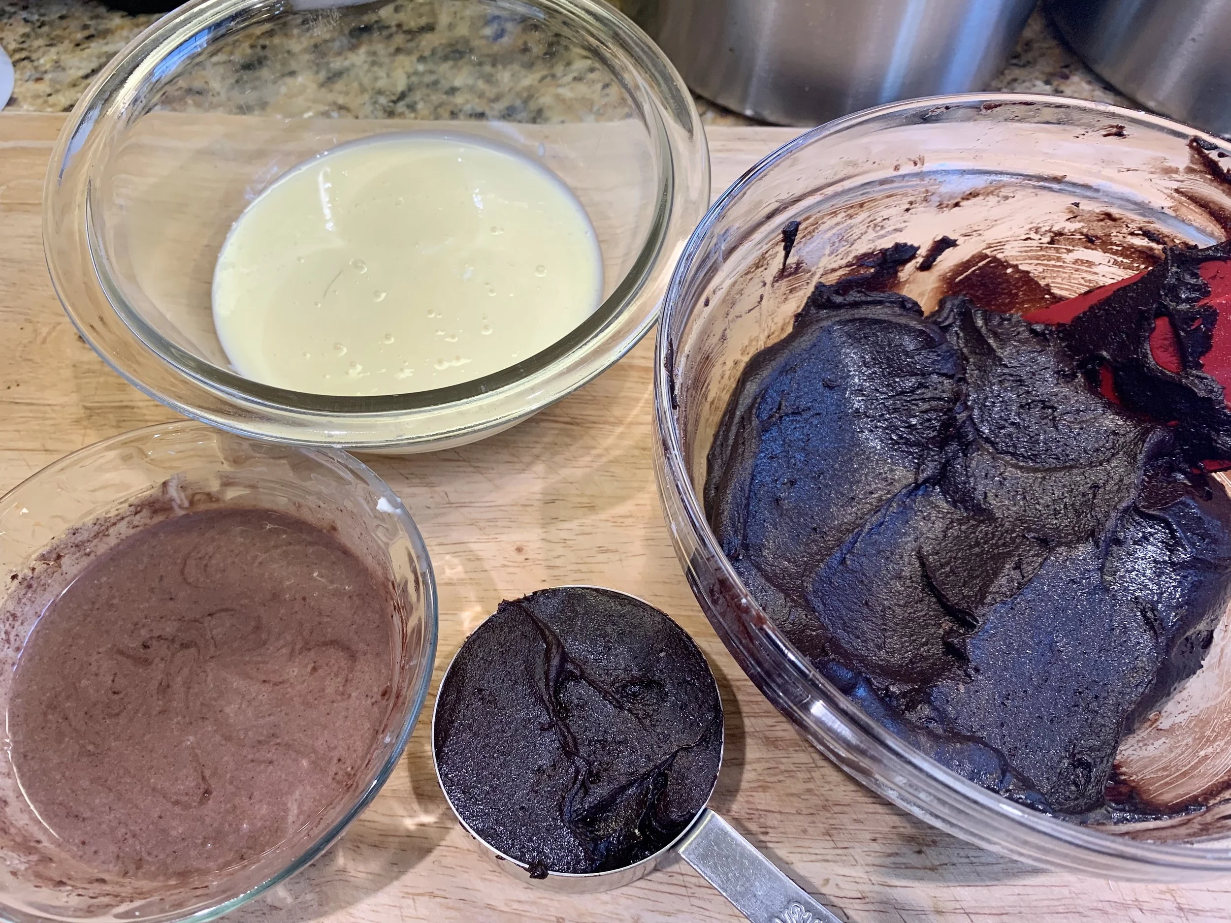 You need 1 large bowl for the brownie batter, on right. Remove 1/2 cup for the topping. A small bowl holds the cream cheese topping, which is divided in half. To the third small bowl with half the cream cheese batter, add 1 1/2 teaspoons unsweetened cocoa. This photo shows the batter with the 3 toppings.