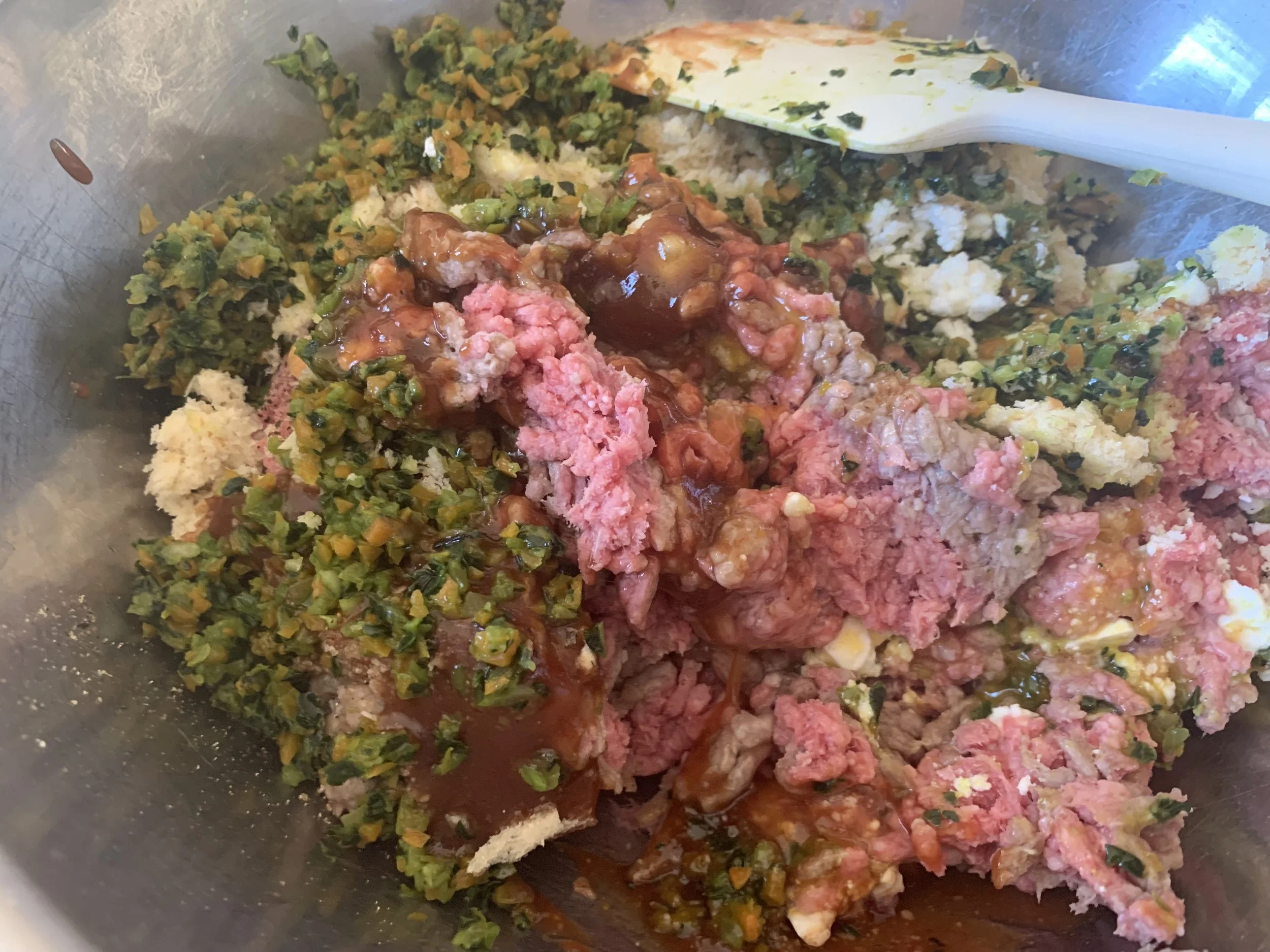 5. In a large mixing bowl, combine the beef, pork, feta, egg, several grinds of pepper, 1/2 teaspoon salt, the breadcrumb mixture, the cooled vegetables, and 3 tablespoons of the ketchup mixture (reserve the rest for brushing on the loaf). Using your hands, mix all of the ingredients together thoroughly without mashing too much. Transfer the mixture to the baking sheet and shape into one long, narrow loaf (about 9 inches long and 4 inches wide) or two or three smaller loaves. Spoon the rest of the ketchup mixture down the length of the top of the loaf (or loaves) and gently spread or brush it over the sides.