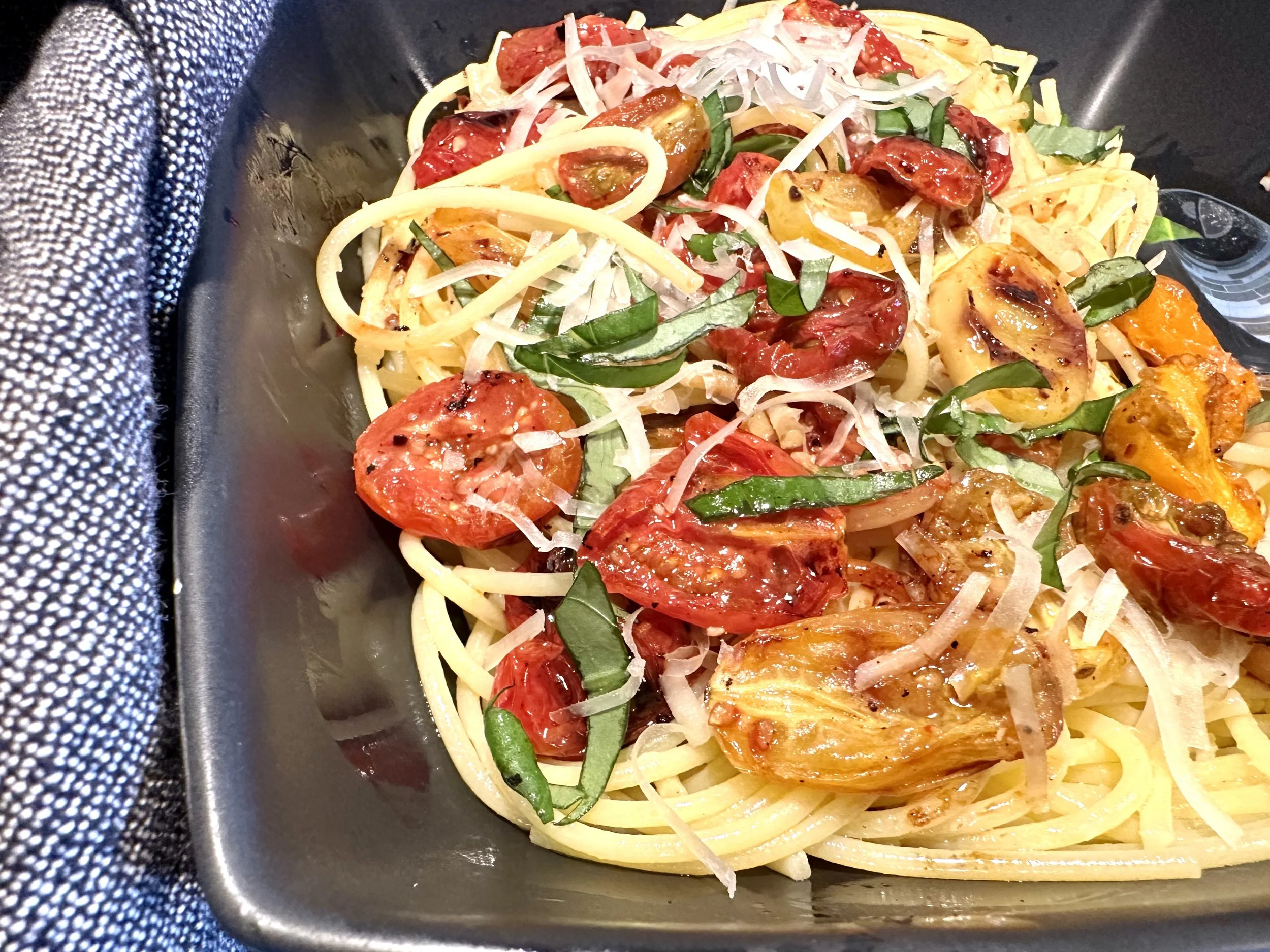 Roasting cherry tomatoes totally heightens their sweetness. They are good in much more than pasta. Try them in omelets, with green beans, asparagus or other green veggies and even in soups. Just be sure to always include the juices from the tomatoes in your pasta.