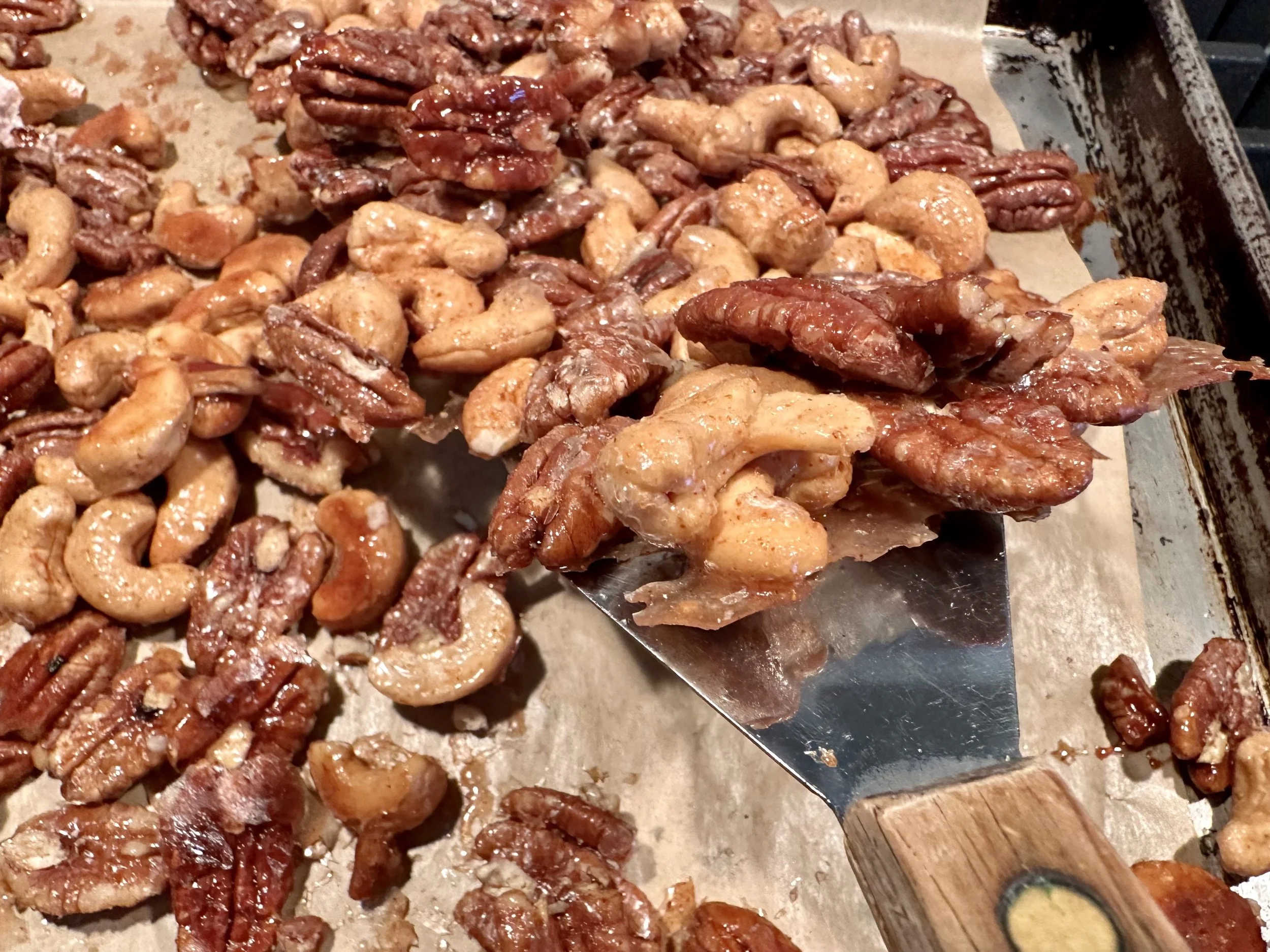 Here is another of David’s recipes that I’ve been making and adapting for years. I j recently brought the nuts to a friend’s home for the Fourth of July, so they are upper most on my mind.