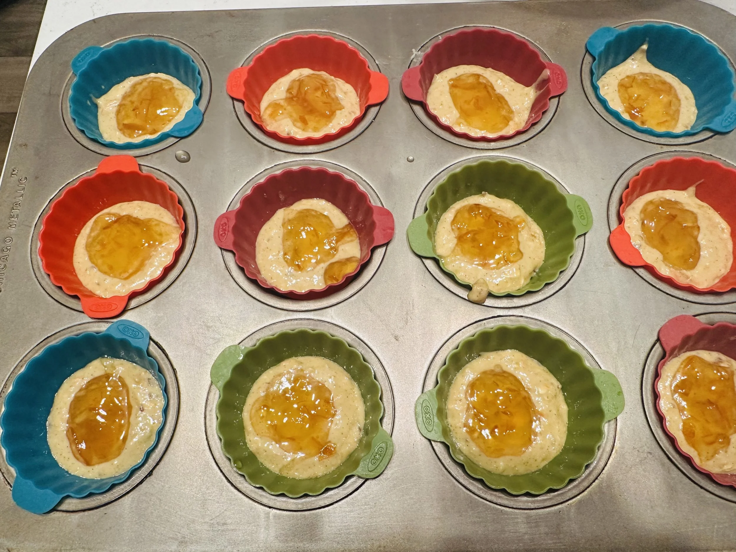 Divide about two-thirds of the batter evenly among the muffin cups. Top each with a heaping teaspoon of marmalade, then cover the marmalade with remaining batter.