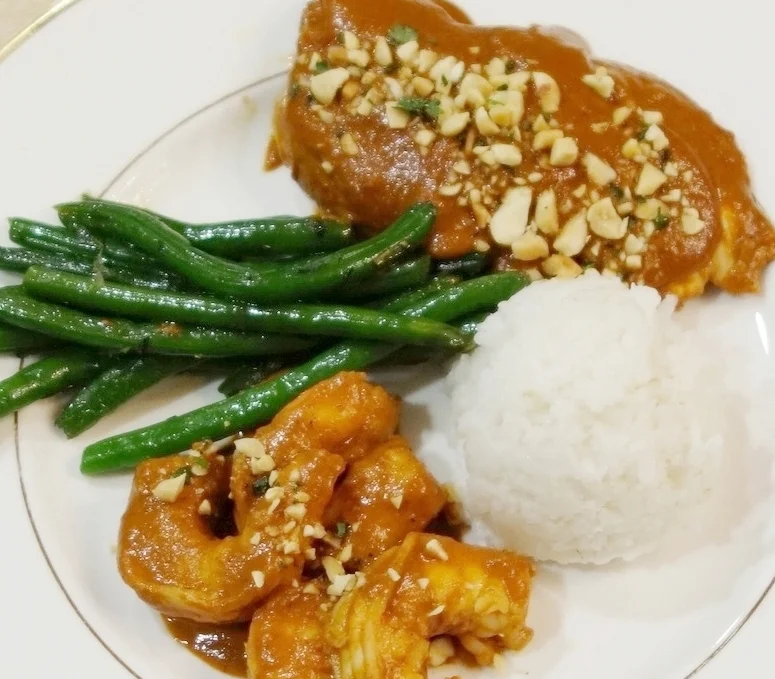 Chicken & Shrimp in Ancho-Chipotle-Sesame Sauce, Coconut Rice with Lime and Green Beans with Summer Savory